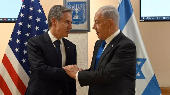 ראש הממשלה בנימין נתניהו נפגש היום (חמישי) עם שר החוץ האמריקני אנתוני בלינקן בלשכתו בקריה בתל אביב. במסיבת עיתונאים שקיימו השניים אמר נתניהו לבלינקן: "אדוני המזכיר, אתה בא הנה לעם כואב, עם לוחם שנחוש לנצח את כוחות הרשע מסביבנו".