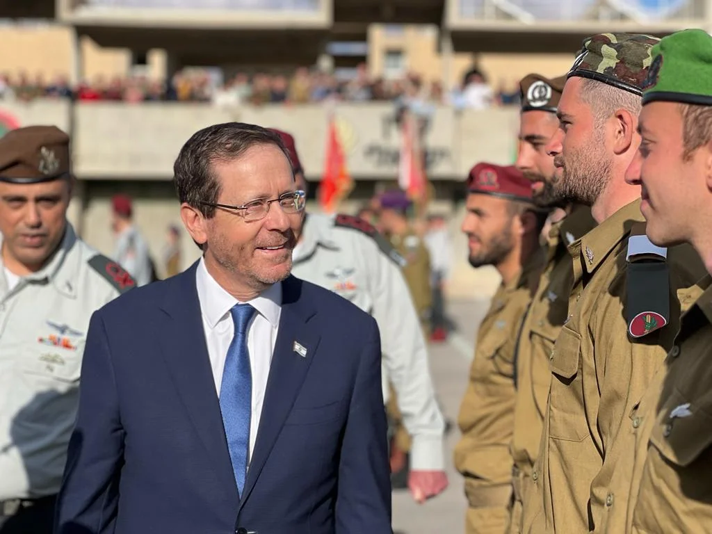 בצל הרפורמה המשפטית והמתיחות הביטחונית, נשיא המדינה יצחק הרצוג והרמטכ"ל הרצי הלוי נאמו היום (חמישי) בטקס סיום קורס קצינים קרביים.